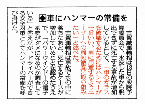車にハンマー常備を… 運輸大臣が発言